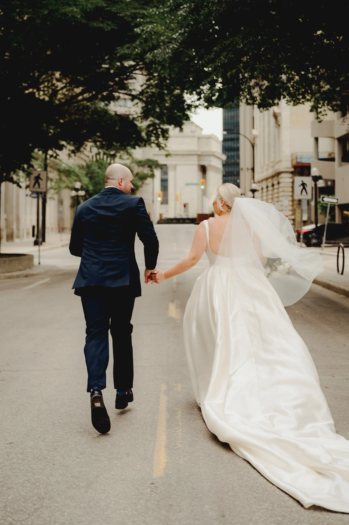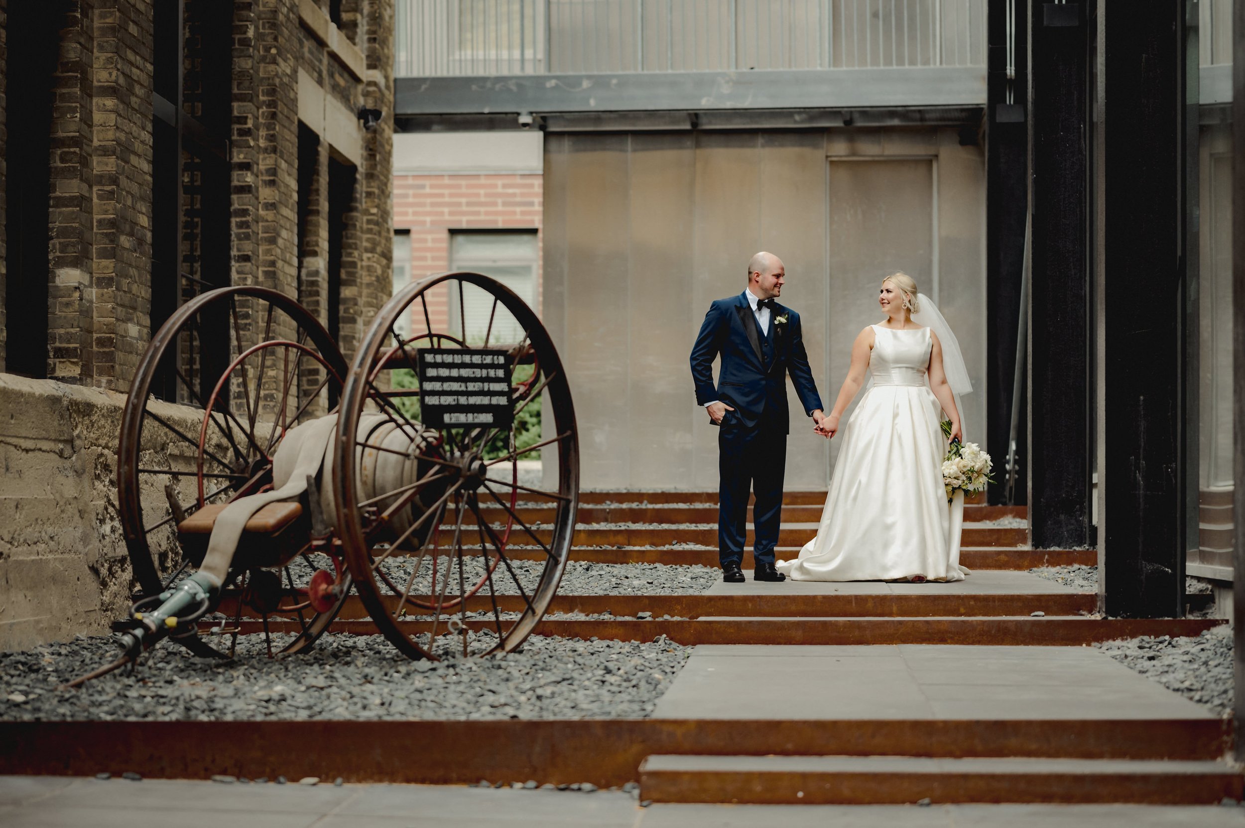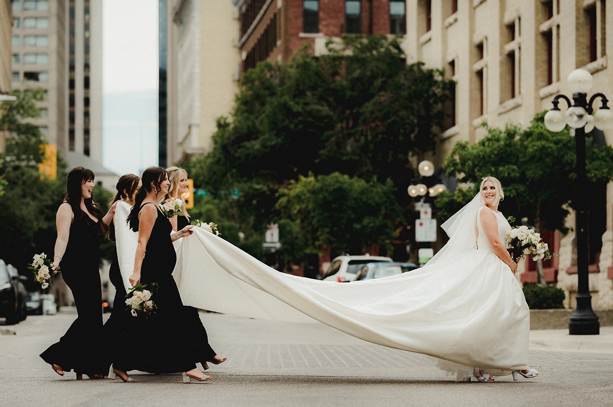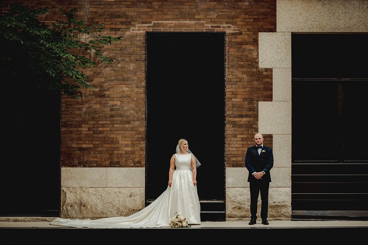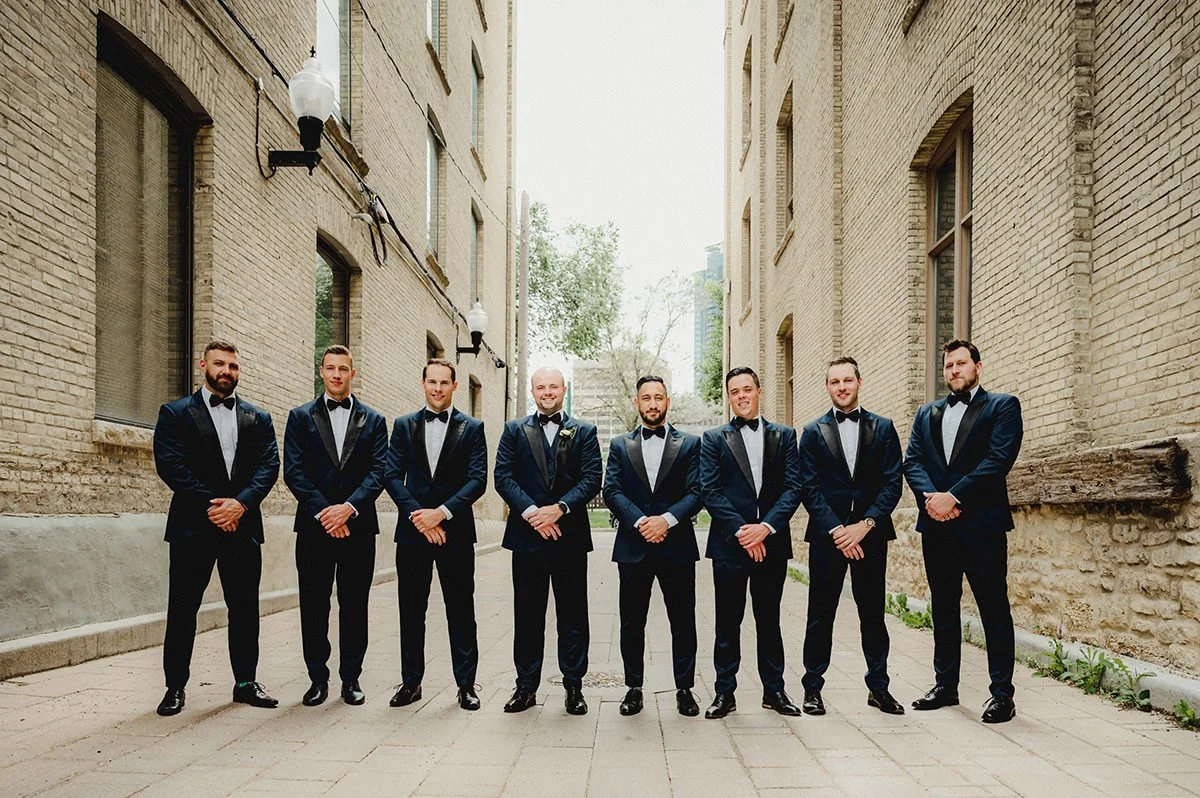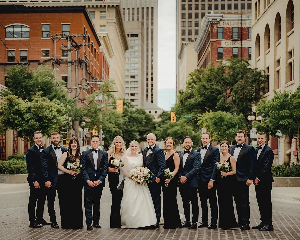 Once the preparations were complete, we headed downtown to capture the couple against the backdrop of Winnipeg’s architectural charm. The Exchange District provided the perfect setting for their New York-inspired wedding attire. The blend of historic buildings and modern elegance created a stunning contrast, making for some truly breathtaking photos that will be cherished for years to come. The city's vibrant atmosphere and Julie and Jeff’s classic style made for a picture-perfect combination.
