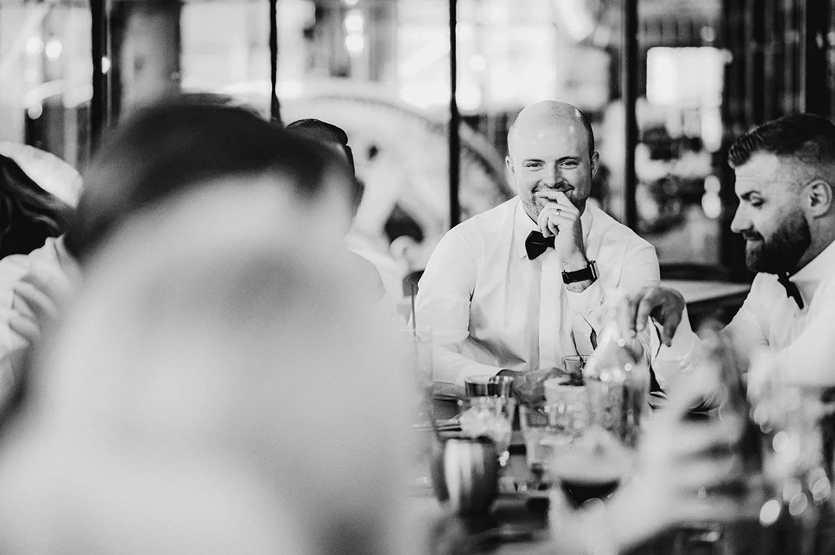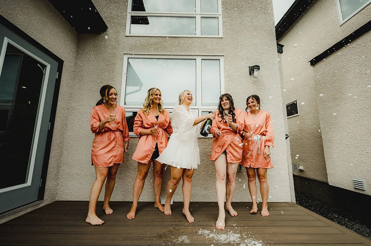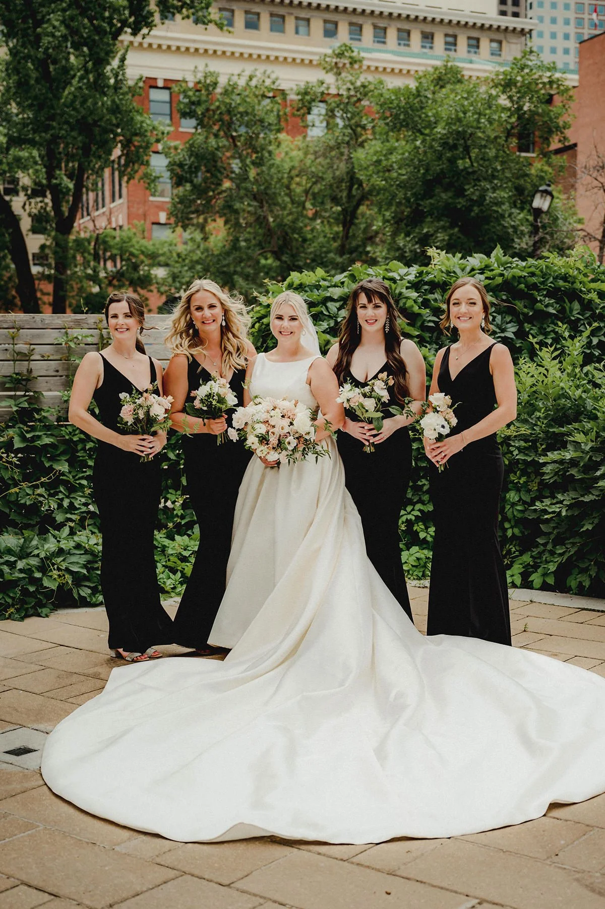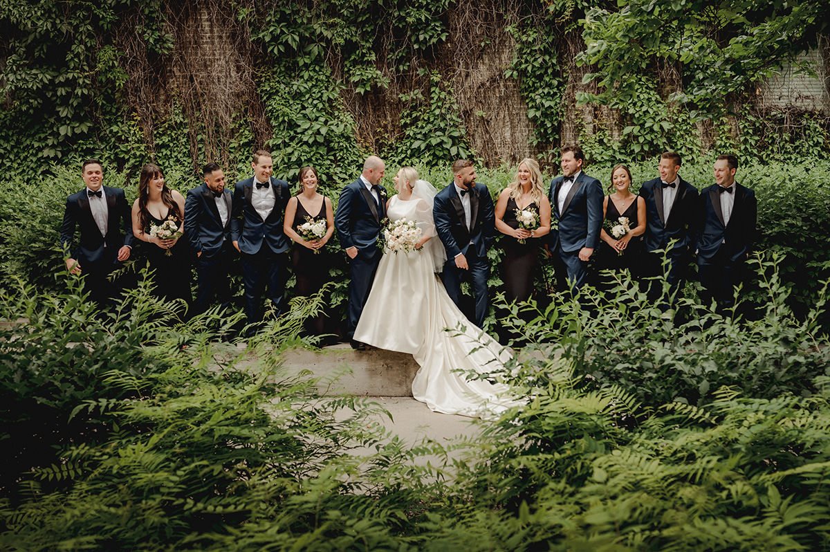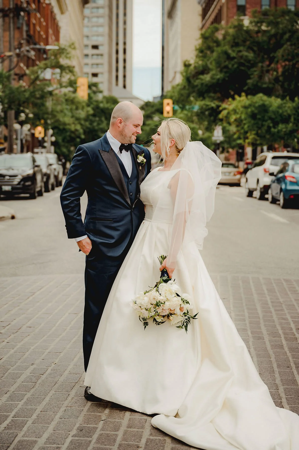Once the preparations were complete, we headed downtown to capture the couple against the backdrop of Winnipeg’s architectural charm. The Exchange District provided the perfect setting for their New York-inspired wedding attire. The blend of historic buildings and modern elegance created a stunning contrast, making for some truly breathtaking photos that will be cherished for years to come. The city's vibrant atmosphere and Julie and Jeff’s classic style made for a picture-perfect combination.