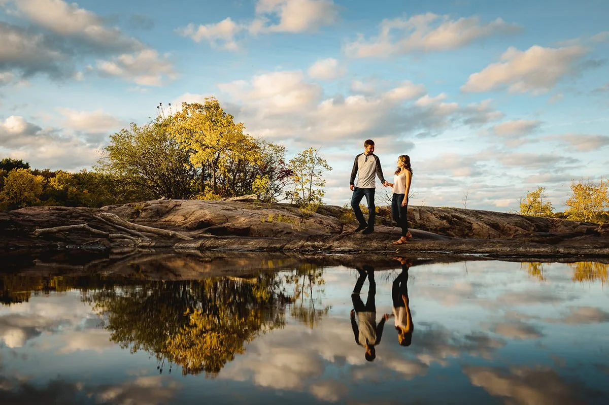 We met Breanna and Dylan as the sun began its descent, casting a golden glow over Whitemouth Falls. The location, usually known for its robust waterfall, was transformed this year by lower-than-usual water levels. While the waterfall was barely flowing, this change unveiled a unique opportunity for us to explore the exposed rocks—nature’s own stage, perfect for a photoshoot that felt both grounded and ethereal.